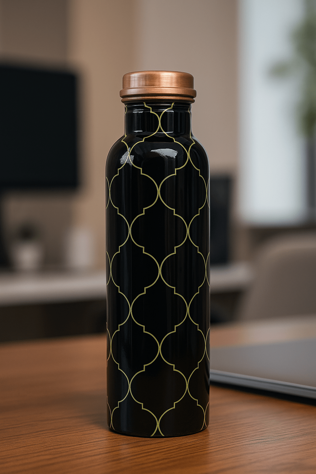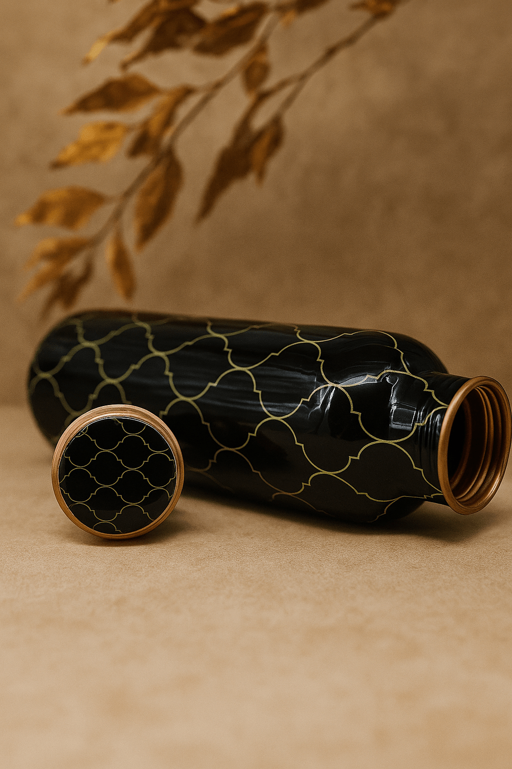 This handcrafted copper water bottle features an intricate mandala-inspired design in soothing black and yellow tones. Made with pure copper, it combines health benefits with artistic elegance. Ideal for daily hydration or as a thoughtful gift.