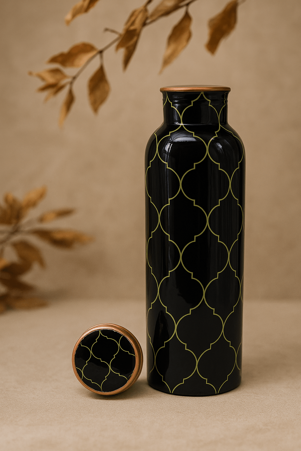 & Free ShippingElegant black and yellow copper bottle with mandala art. Made from pure copper for traditional health benefits. 1L capacity