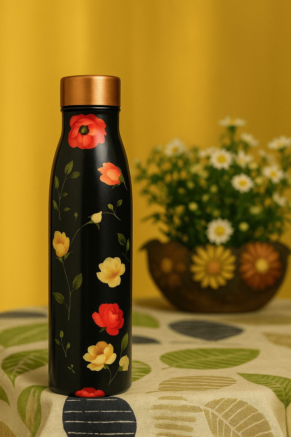 Elevate your hydration game with this beautifully handcrafted floral copper bottle featuring a sleek black matte finish. Designed with vibrant floral art, this 1-litre copper water bottle combines tradition with modern aesthetics. Made from 100% pure copper, it naturally purifies water and provides numerous health benefits including improved digestion and immunity. Ideal for home, office, yoga, or gifting. Leak-proof, durable, and BPA-free.