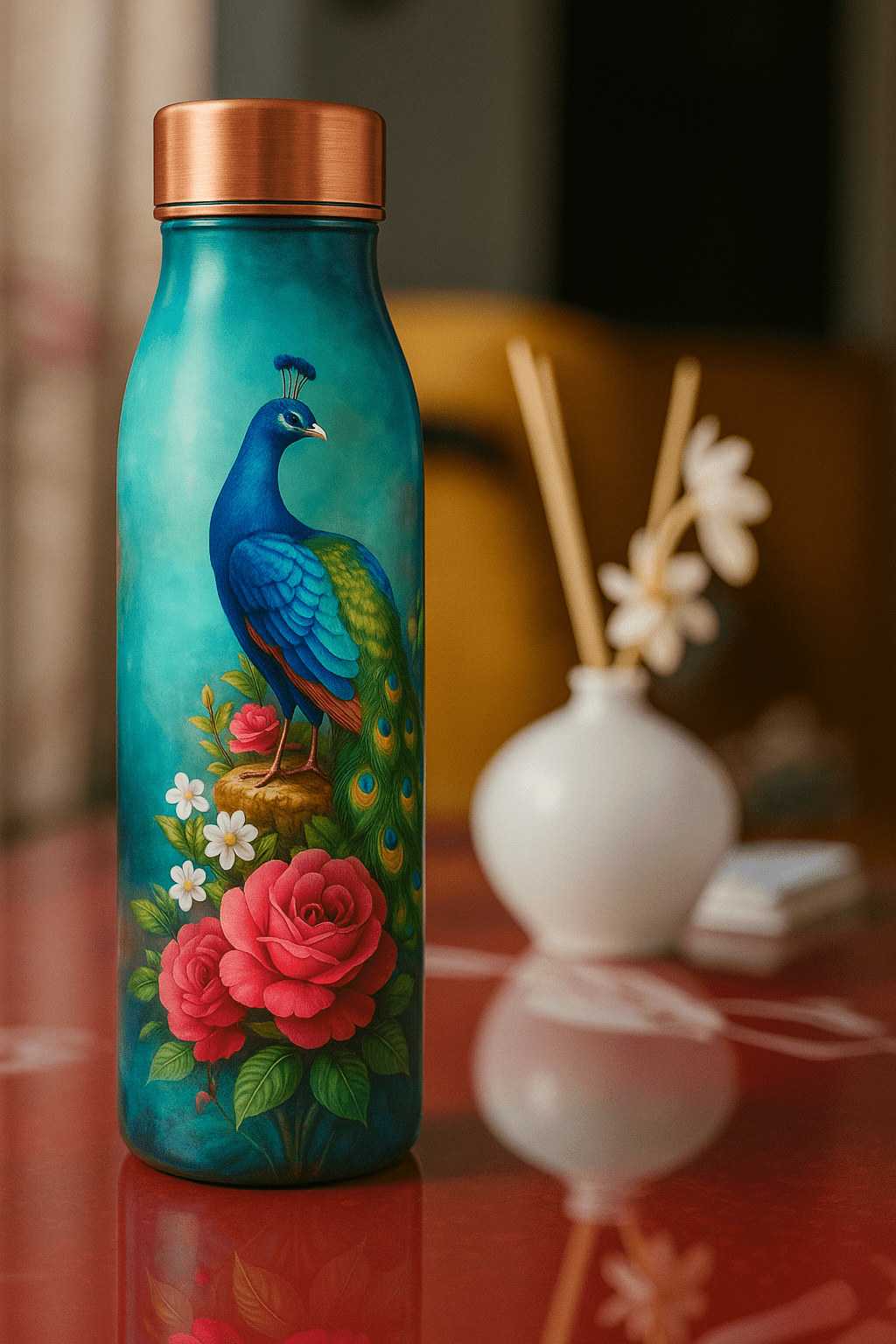 Premium Peacock designer copper water bottle, 1L.