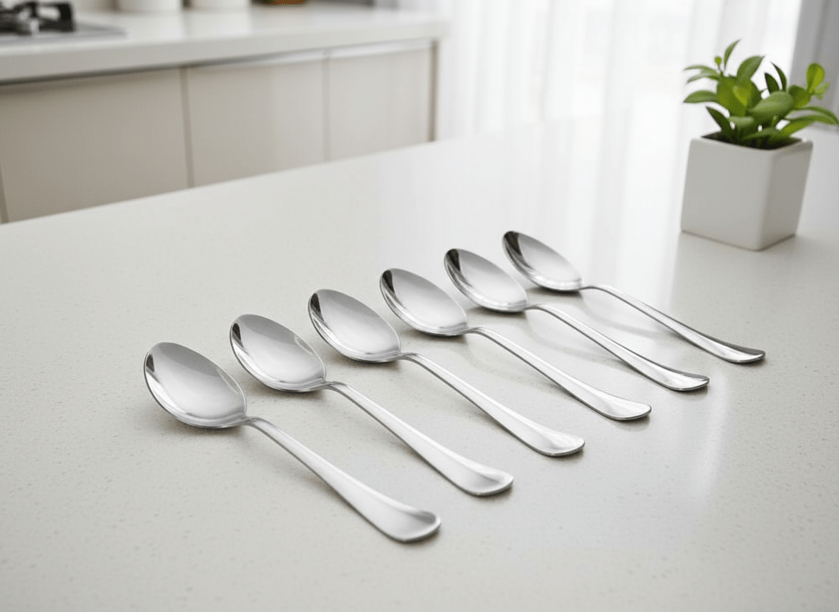 - 6 stainless steel spoons with smooth, rounded edges